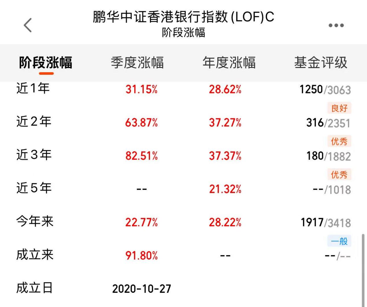 说到这里,就不得不提一只业绩亮眼的基金——$鹏华中证香港银行指数(LOF)C$(基金代码:010365)。这只基金就像一位贴心的投资管家,帮你把香港银行的核心资产都打包好。它近1年上涨31.15%,近2年上涨63.87%,近三年上涨82.51%,成立以来更是取得了91.80%的收益。简单算一笔账:如果三年前投10万元,现在差不多能变成18万多。更方便的是,它采用指数化运作,不用自己费心选股,基金经理会自动帮你跟踪指数成分股的变化。