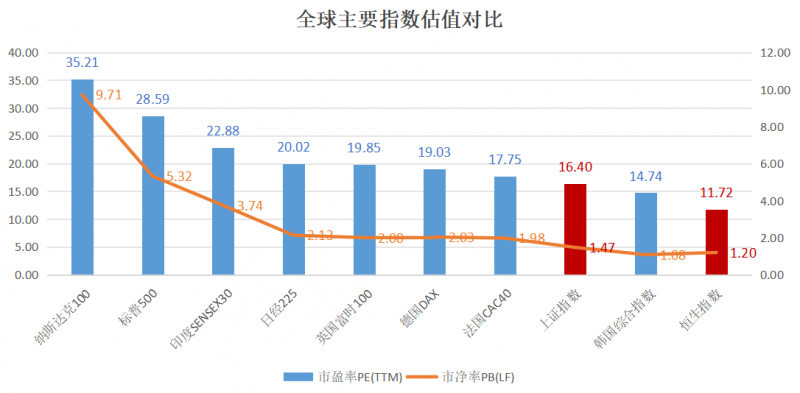目前来看,相较于全球主要资本市场相关指数,恒生指数、韩国综合指数、上证指数的估值仍处于较低水平。