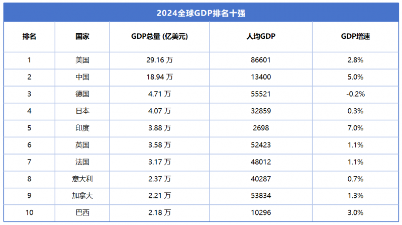 权益市场本质是经济体发展的“晴雨表”,经济增长的动能、质量与持续性,直接影响企业的营收扩张空间、盈利兑现能力,进而决定权益资产的长期增值潜力。目前,不同经济体的增长差异显著,据国际货币基金组织IMF数据显示,2024年全球GDP排名前十的国家中,美国GDP位居榜首,中国紧随其后,GDP总量达到18.94万亿美元。其他国家如德国、日本、印度等分别排在第三到第十位。