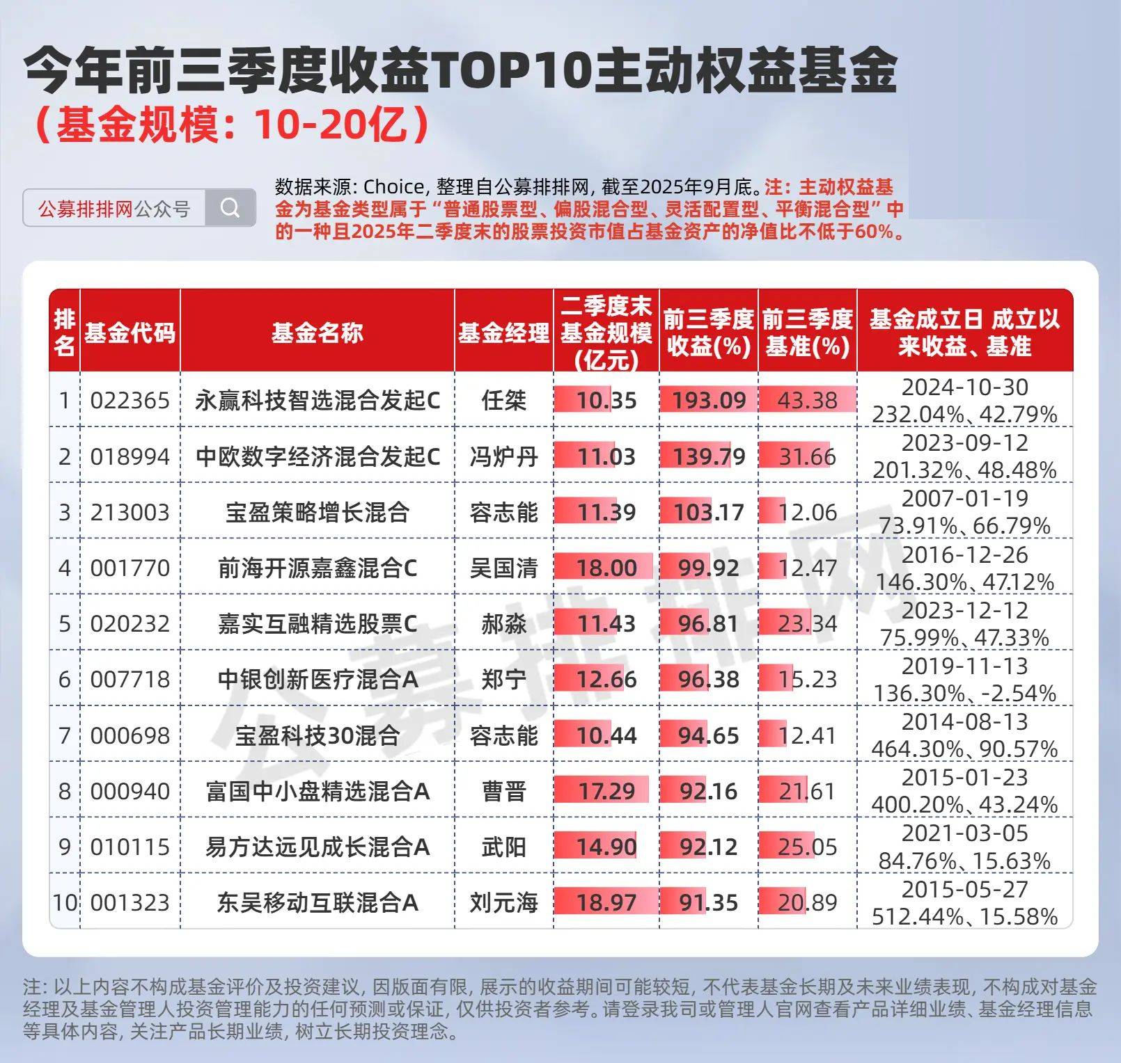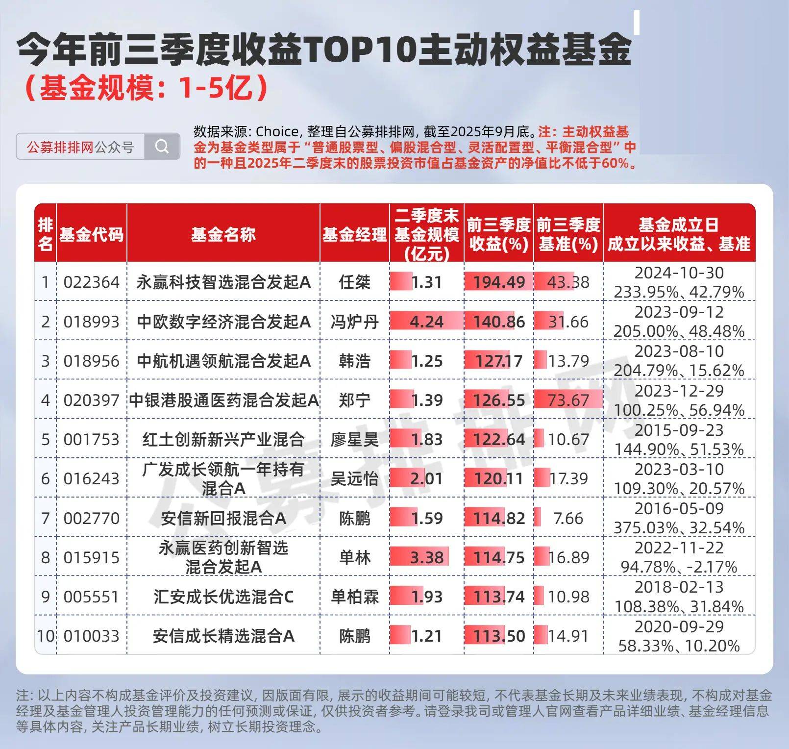 经公募排排网整理统计,2025年二季度末基金规模在1000万-1亿的主动权益基金达2555只,今年前三季度收益均值为34.35%,收益前10的上榜“门槛”为109.42%。