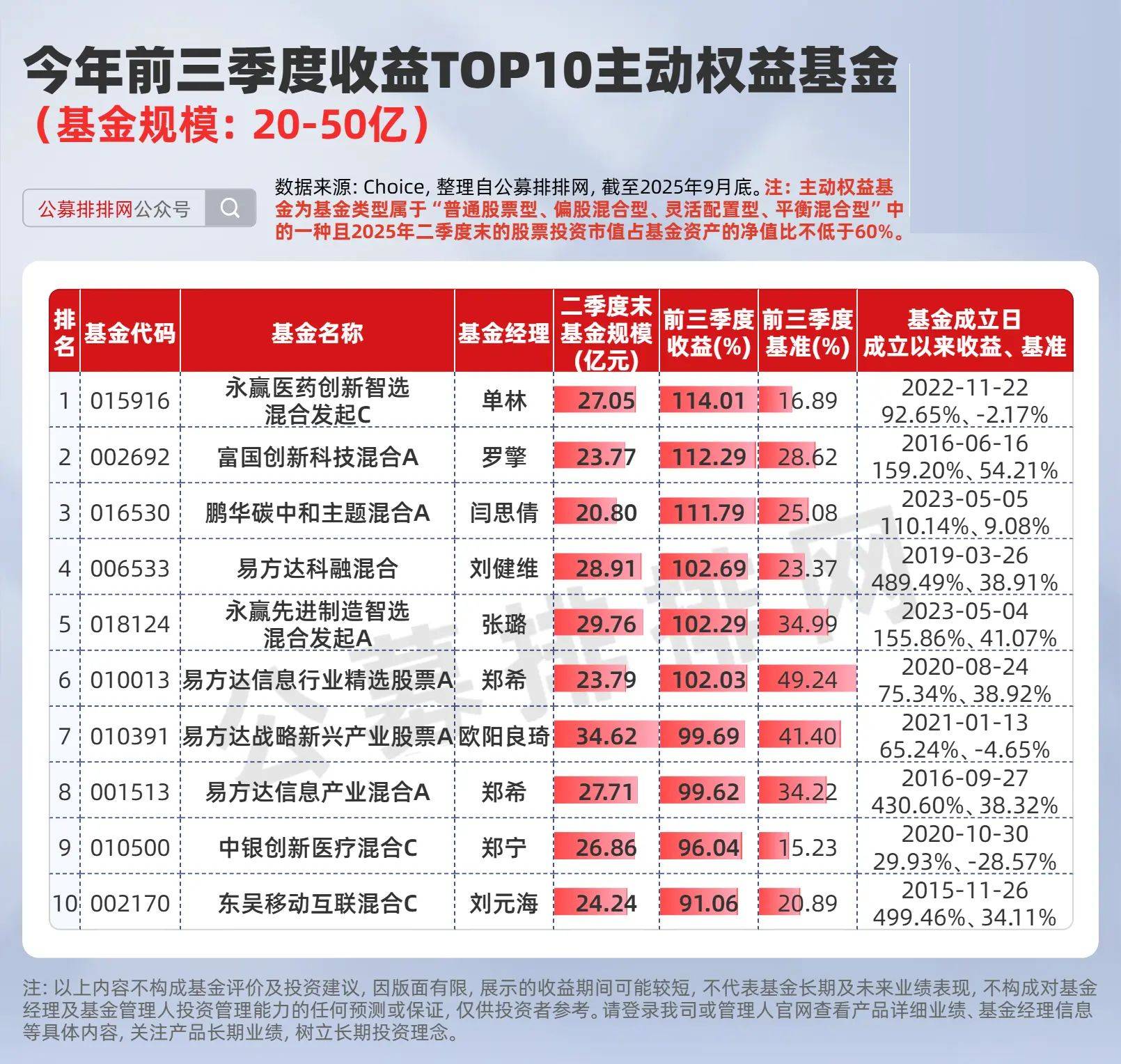 公募排排网整理统计,2025年二季度末基金规模在20-50亿的主动权益基金共320只,今年前三季度收益均值为40.07%,收益前10的上榜“门槛”为91.06%。
