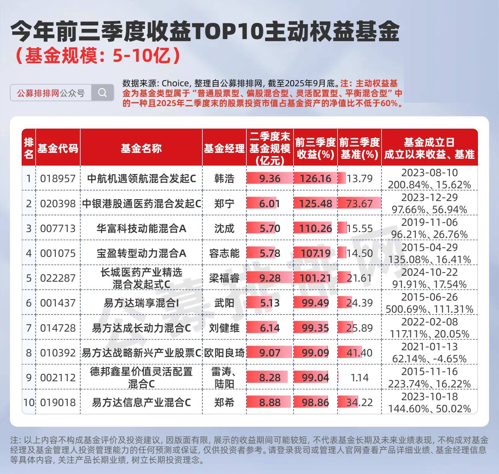 经公募排排网整理统计,2025年二季度末基金规模在5-10亿的主动权益基金达667只,今年前三季度收益均值为36.73%,收益前10的上榜“门槛”为98.86%。