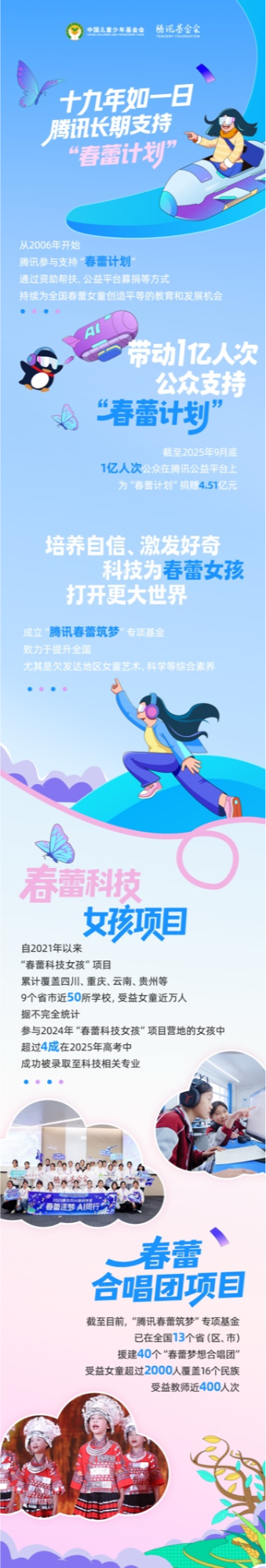 自2021年起,中国儿童少年基金会与腾讯公益慈善基金会等爱心力量共同播下的种子,如今已破土而出,迎风生长。“春蕾梦想合唱团”公益项目如星星之火,已在全国20个省(区、市)落地生根,为逾2000名女童带去了专业训练与合唱教育,建立了56个希望之团,引领她们在艺术海洋中自由探索、勇敢追梦;“春蕾科技女孩”公益项目则如涓涓细流,面向初高中阶段的春蕾女孩,围绕AIGC等前沿科技、文化自信等内容开展科技营地项目制学习,打造的初中科技普惠课程+高中研学实践体系化培养模式,已在四川、云南、贵州等9个省(市)近50所学校落地,浸润了近万名女孩的心田,引领她们在科技领域收获更长远的发展。