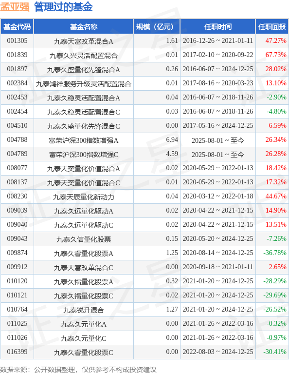 孟亚强先生:中国国籍,南开大学保险精算硕士,中国籍,具有基金从业资格。历任博时基金管理有限公司研究员、基金经理助理、投资经理。2009年7月至2015年8月,就职于博时基金管理有限公司,历任股票投资部量化研究员、基金经理助理、投资经理。2015年8月至2024年12月,就职于九泰基金管理有限公司,历任绝对收益部基金经理、天元量化投资部总经理、权益投资部联席总监、基金经理。2025年2月加入富荣基金,现任量化投资部总经理、基金经理。曾任九泰久稳灵活配置混合型证券投资基金(原九泰久稳保本混合型证券投资基金,2016年6月7日至2018年11月26日)、九泰鸿祥服务升级灵活配置混合型证券投资基金(2017年8月16日至2020年3月23日)的基金经理,任九泰久盛量化先锋灵活配置混合型证券投资基金(2016年6月7日至2024年12月25日)、九泰天富改革新动力灵活配置混合型证券投资基金(2016年12月26日至2021年1月11日)、九泰天辰量化新动力股票型证券投资基金(2020年3月12日至今)、九泰久远量化驱动股票型证券投资基金(2020年4月22日至今)的基金经理。2020年5月29日至2022年1月13日担任九泰天奕量化价值混合型证券投资基金基金经理。2017年2月10日至2020年9月22日担任九泰久兴灵活配置混合型证券投资基金基金经理。九泰久福量化股票型证券投资基金(2021年1月20日至2024年12月25日)、九泰锐升18个月封闭运作混合型证券投资基金(2021年1月20日至今)、九泰久元量化股票型证券投资基金(2021年1月26日至今)的基金经理。曾任九泰久信量化股票型证券投资基金基金经理、九泰锐升混合型证券投资基金基金经理、九泰久睿量化股票型证券投资基金基金经理。2025年8月1日起任富荣沪深300指数增强型证券投资基金基金经理。