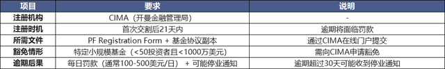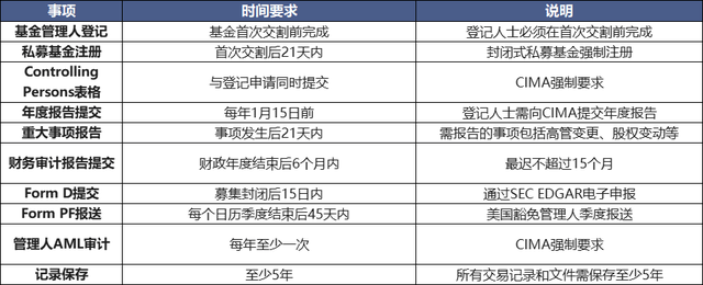 年度报告:基金管理人(如为登记人士)需要在每年1月15日前向CIMA提交年度报告,说明基金的运营情况、合规状况等。