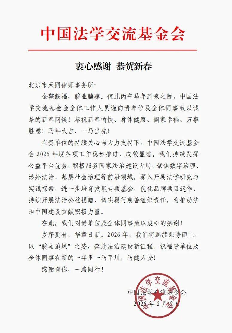 2026-02-17米兰体育,米兰体育官方网站,米兰体育APP下载岁聿云暮,新元肇启。值此万象更新之际,北京市天同律师事务所收到中国法学交流基金会发来的新春贺信,字里行间满载的拳拳厚谊和美好祝愿,令全体天同人倍感温暖、深受鼓舞!