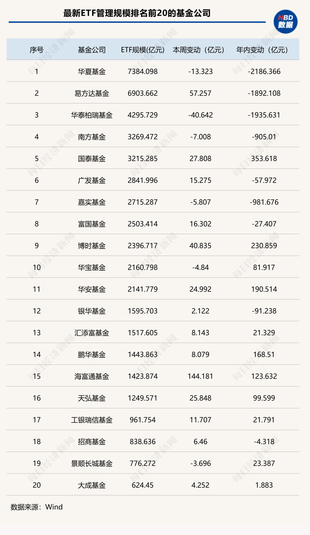 另一方面,本周华泰柏瑞和华夏基金ETF规模分别缩水40.64亿元和13.32亿元,其他头部机构缩水额均低于10亿元。
