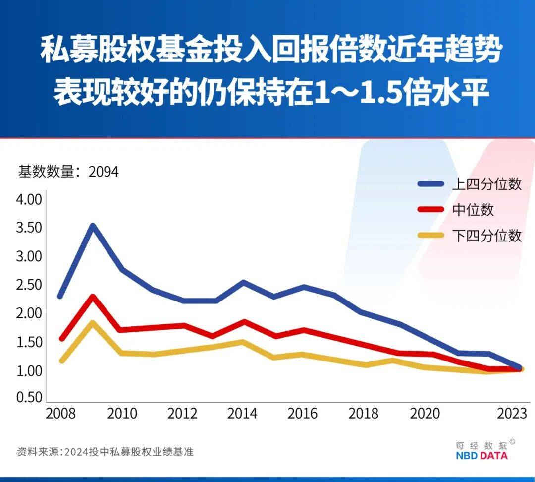 从投中研究院统计的数据来看,从2008年至今,被纳入统计范畴的私募股权基金TVPI近年呈逐年下降趋势,从2021年到2023年的算数平均数为1.2~1.3。这意味着行业整体处于盈亏平衡的临界状态,相比之前普遍在2倍以上有显著降低。